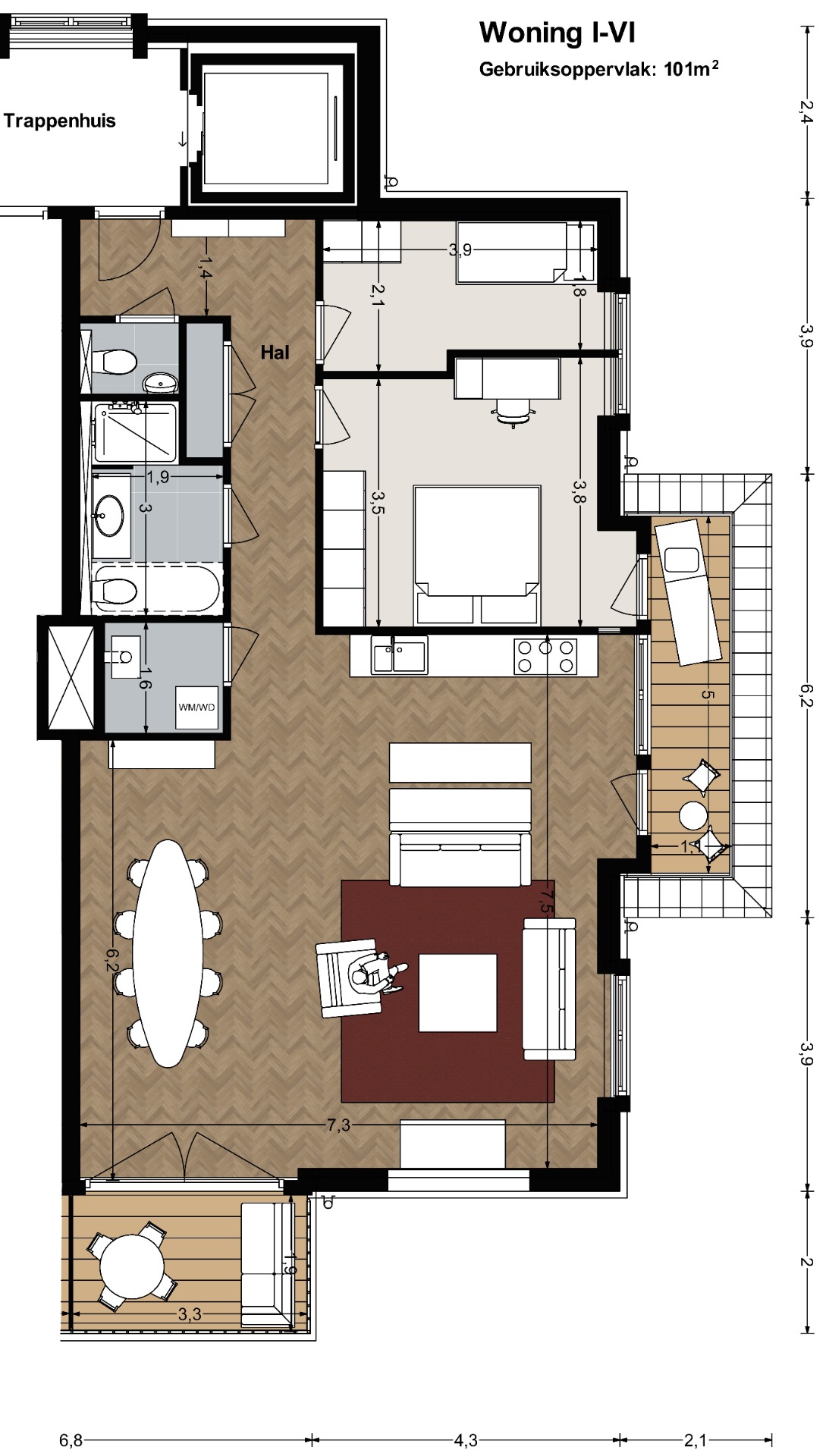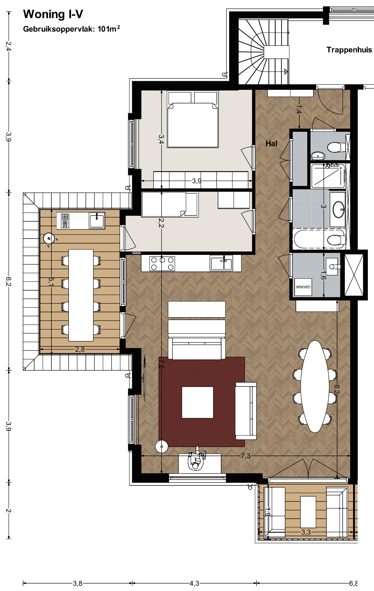 In samenwerking met de architect en aannemer kunnen wij uw wensen inzichtelijk maken. Wij hebben een aftrap gemaakt voor het penthouse, maar de indeling kan natuurlijk gewijzigd worden.